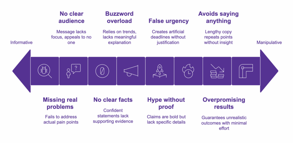 - Buzzword overload: if the copy is packed with trending phrases but doesn’t explain what they mean, it’s just noise dressed as value.