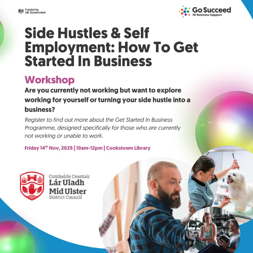 Taking place on Friday, 14th November from 10am to 12pm at Cookstown Library, Side Hustles & Self Employment: How To Get Started In Business will introduce the Go Succeed: Get Started In Business programme, which is being delivered by Excalibur Press on behalf of Mid Ulster District Council.
